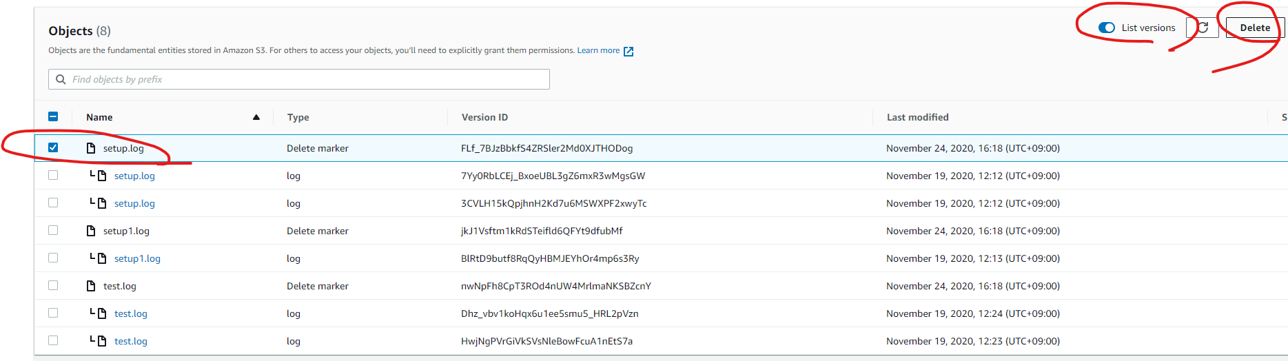 아래 그림은 버저닝 리스트 보기를 활성화한 상태로 같이 Type 부분에 Delete marker라고 찍히고 삭제되어 있는 모습을 볼수있다.