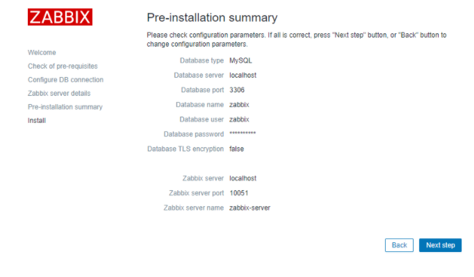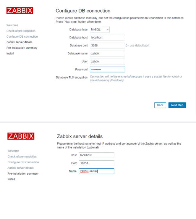 - DB 접근 정보 설정(해당 캡쳐는 zabbix 서버내에 mysql을 설치한 사례)