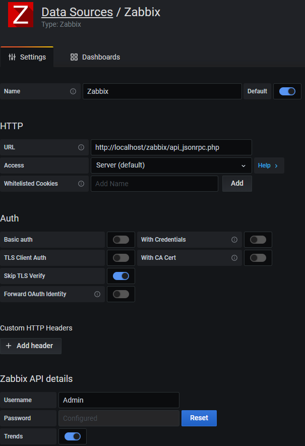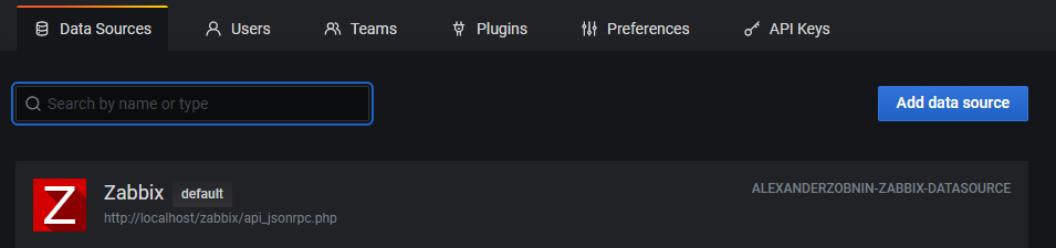 Grafana 접근 후 설정에서 Data Sources에 zabbix 추가.