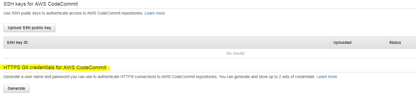 2. 하단 부 HTTPS Git credentials for AWS CodeCommit → Generate 클릭