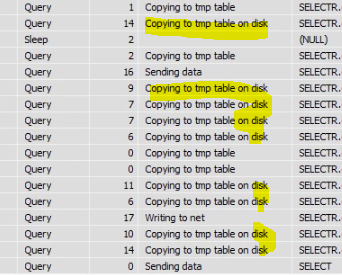 lock걸린 테이블 또는 processlist를 보면 아래와 같이 "Copying to tmp table" 또는 "Copying to tmp table on disk" 두개의 state 확인이 가능하다.