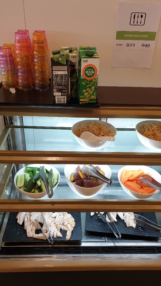가끔 일부 메뉴가 변경되기는 하지만 고정 메뉴는 수비드 닭가슴살, 호박/밤 고구마, 현미밥, 브로콜리등 야채류, 저지방 소스가 매일 변경되는 식사와 달리 고정으로 나온다.