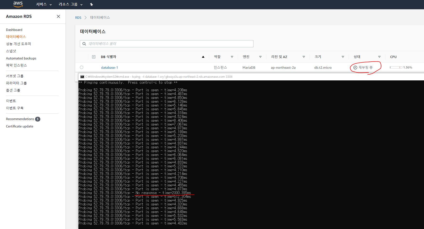 재부팅이 없이 된다는것을 보여주기 위해 3306 포트로의 ping 체크를 했으나 이렇게 ping 테스트를 할경우 DB connection error 제한에 따른 모든 유저의 접근차단이 됨.