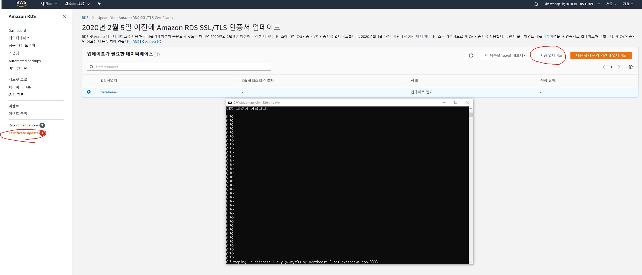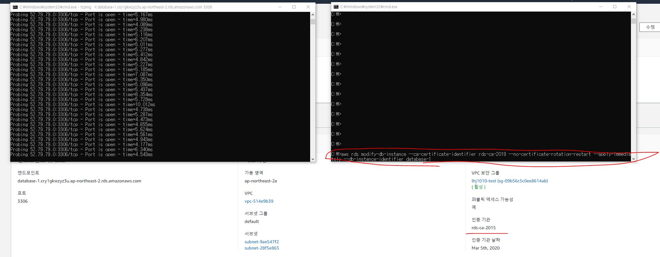 aws rds modify-db-instance --ca-certificate-identifier rds-ca-2019 --no-certificate-rotation-restart --apply-immediately --db-instance-identifier <RDS명>
