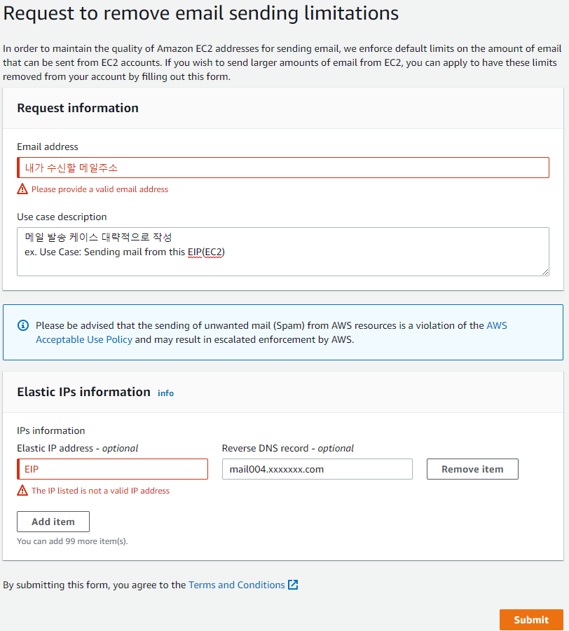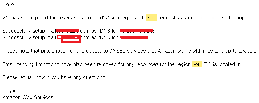 EIP에 대해 메일제한해제 및 Reverse DNS 등록을 AWS에 요청해야 하는데 하기전 미리 요 작업을 해놔야 한다.