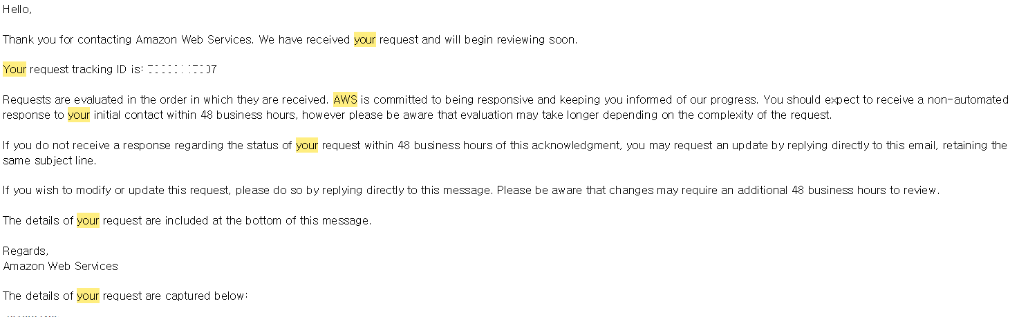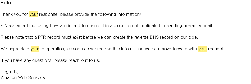 4. AWS에 메일 서버로 사용하겠다고 요청(영어로 작성) + Reverse Domain 등록